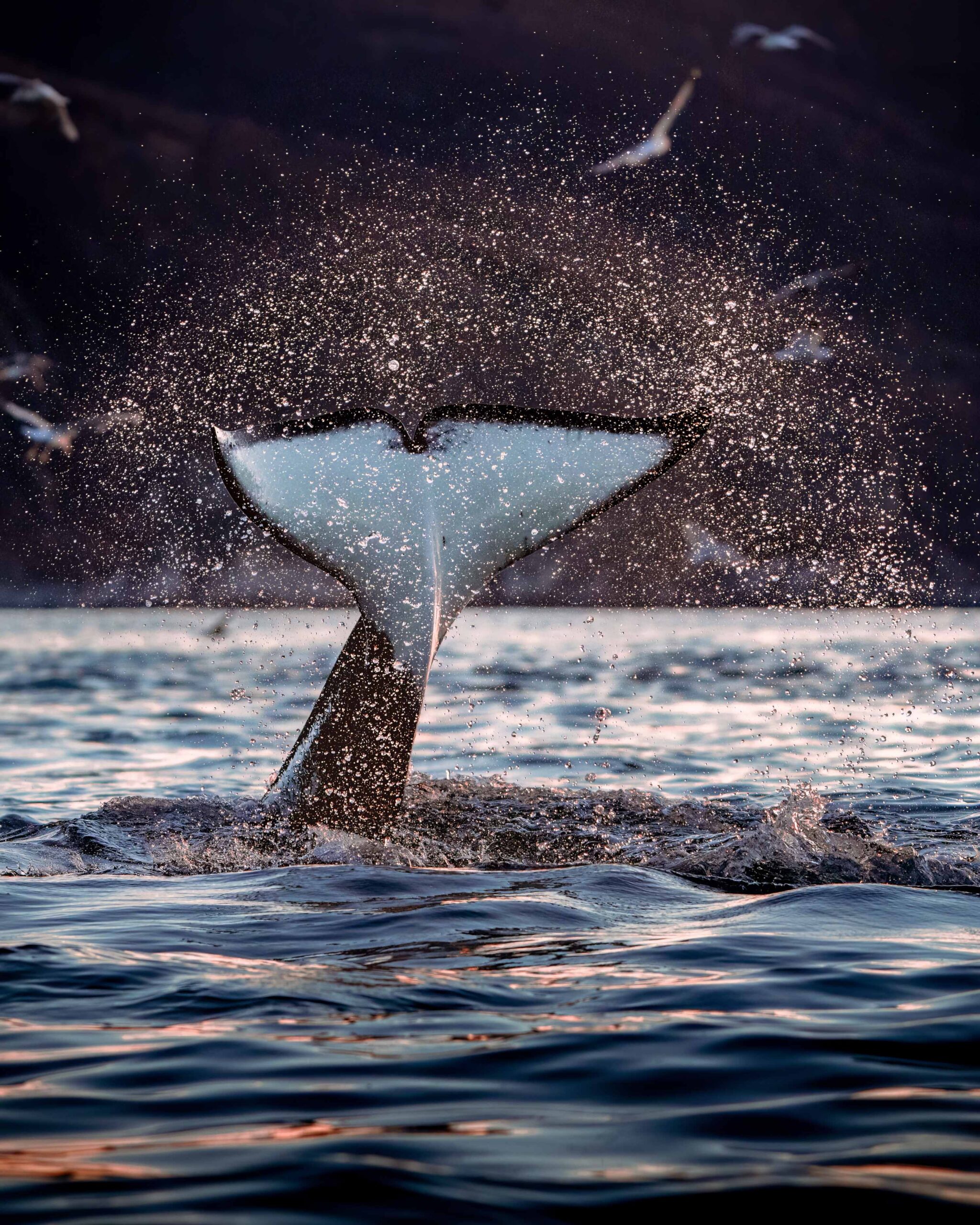 The best months to go and see whales around Tromso and Skjervøy are from beginning of November until the end of January where hundreds of Orcas and other giants gather to feed on herring.